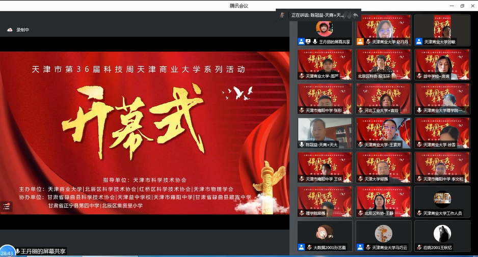 5月29日上午,天津市第36届科技周天津商业大学系列活动开幕式暨“强国有我,青年担当”师生协同创新报告会通过线上形式开展。天津市科协副主席卢双盈、我校副校长陈冠益、北辰区科学技术协会主席段玉环、红桥区科学技术协会副主席张莉杨、天津益中学校校长袁爽、天津市雍阳中学校长李文和出席。来自天津大学、河北工业大学、天津益中学校、天津市雍阳中学、甘肃省正宁县第四中学、天津市北辰区集贤里小学以及我校的专家和师生 600余人参加。
