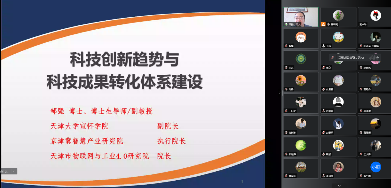 6月15日下午,理学院举办科技创新与成果转化能力提升培训会,会议邀请京津冀智慧产业研究院执行院长、天津市物联网与工业4.0研究院院长、天津大学宣怀学院副院长邹强博士作为主讲人,以线上形式举办。理学院班子成员、教师和研究生80余人参会,副院长周严主持。
