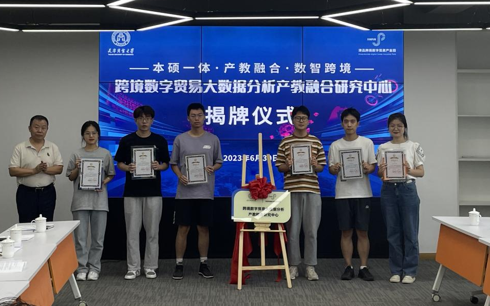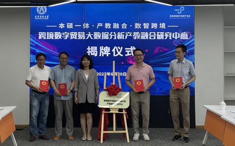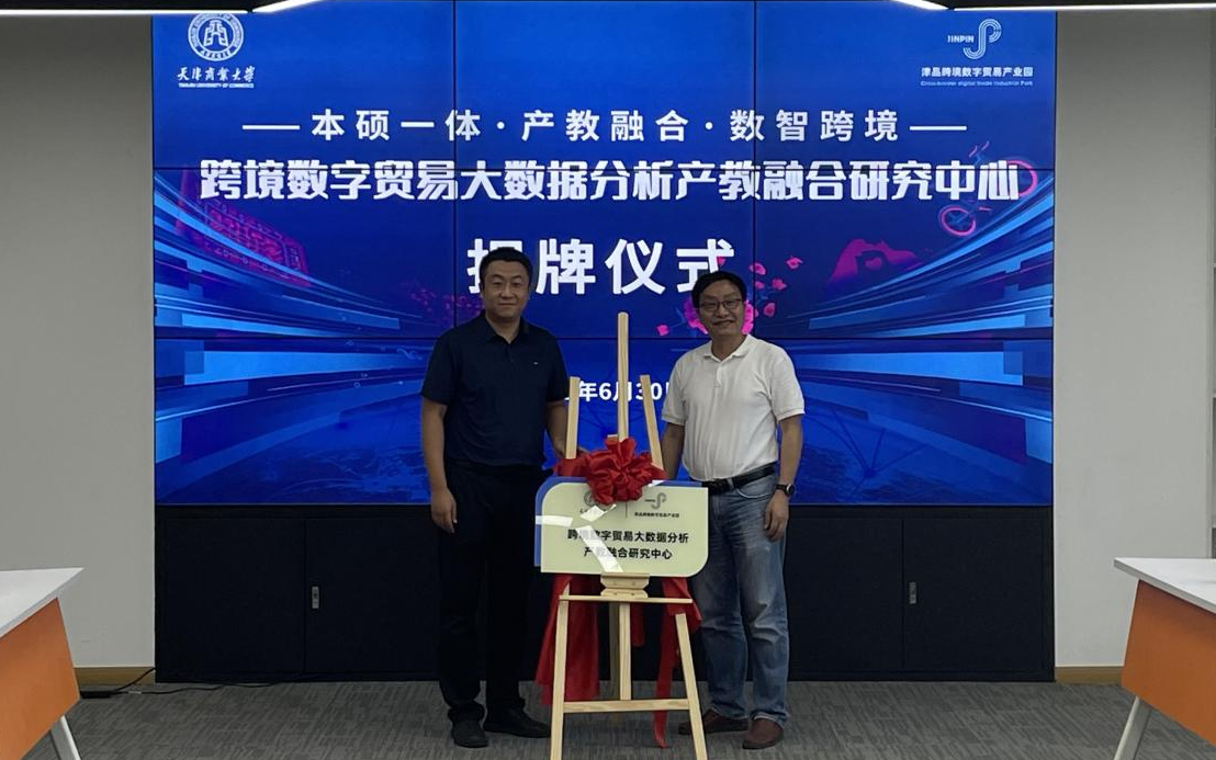 6月30日下午,天津商业大学与津品跨境数字贸易产业园联合创立的跨境数字贸易大数据分析产教融合研究中心揭牌仪式在津品跨境数字贸易产业园5楼会议室举行。