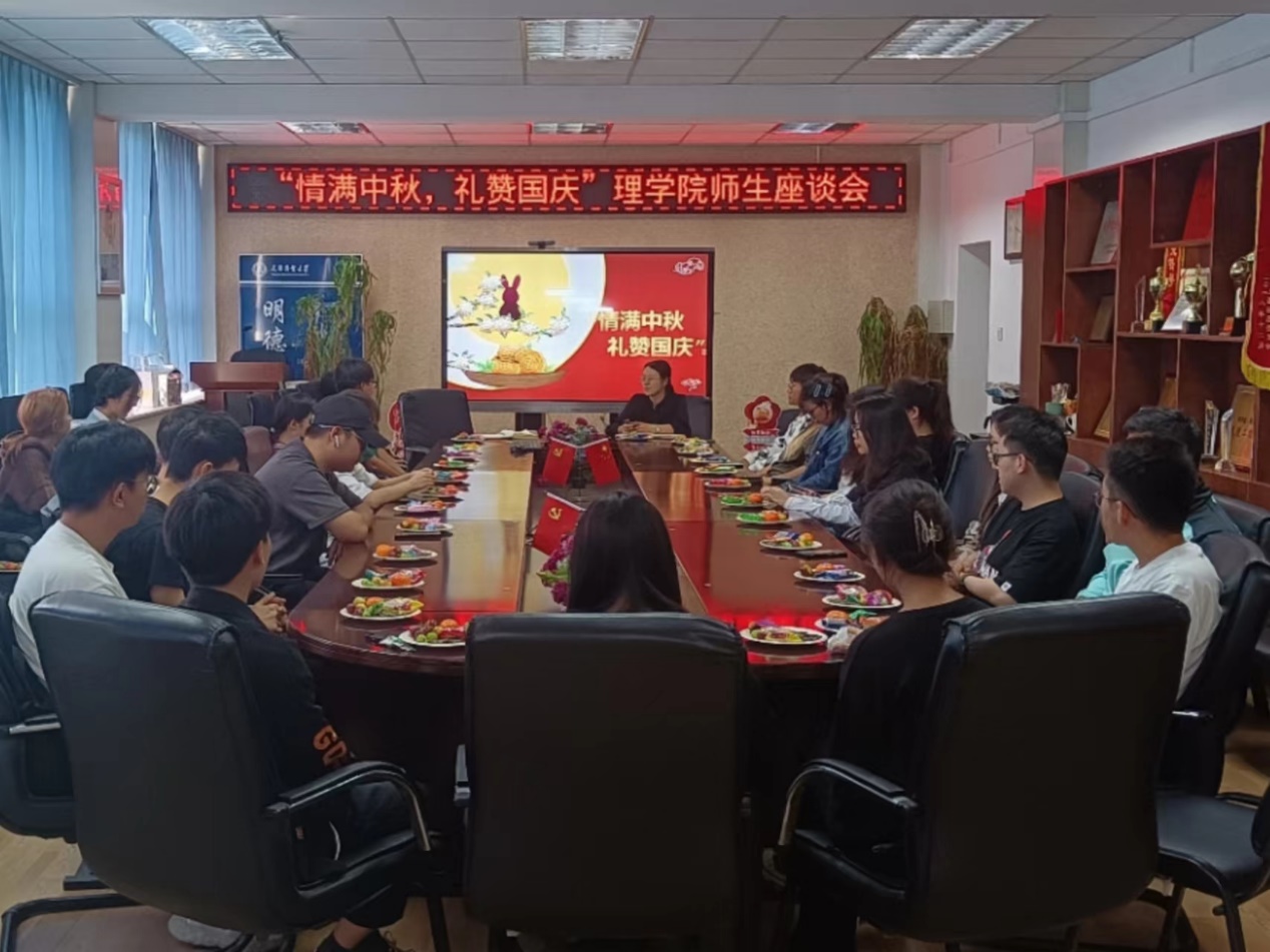 与此同时,理学院还组织开展了“情满中秋·礼赞国庆”师生座谈会。学院党委副书记王素芳代表学院祝同学们节日快乐,天商就是同学们的第二个家,希望同学们能够通过学校和学院的关心感受到“家”的温暖;并希望同学们学会感恩,要感恩繁荣昌盛的伟大祖国给我们带来祥和幸福的生活,要感恩父母老师的养育与培养。她希望同学们具备“三态”:一是“健康的体态”,鼓励同学们多多参加体育锻炼、强健体魄;二是“向上的状态”,鼓励同学们发奋学习,积极参加实习实践,锻炼报效祖国的本领能力;三是“乐观的心态”,鼓励同学们积极面对困难,用乐观的心态拥抱生活。同学们在温馨愉悦的氛围中畅所欲言。大家一起分享新学期的新规划,辅导员耐心解答同学们在学习、生活、实习实践等方面存在的困惑。师生一起畅谈理想、规划学业、品味月饼。学院还邀请了三位在10月1日出生的学生参加座谈会,为其庆生,共同祝愿伟大祖国繁荣昌盛。