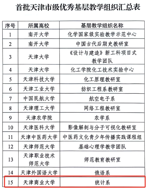 近日,市教委公布了首批天津市级普通高校优秀基层教学组织评选结果,共评选出25个市级优秀基层教学组织,我校理学院统计系基层教学组织成功入围。