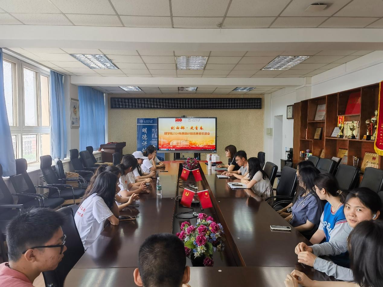 6月18日,理学院在一号教学楼806会议室举办“到西部更青春”西部计划志愿者欢送会,学院党委副书记王素芳、毕业年级辅导员乔亮、院团委负责人狄佩佩、9名西部计划志愿者以及院团委学生干部、各年级有意向参加西部计划学生30余人参加。