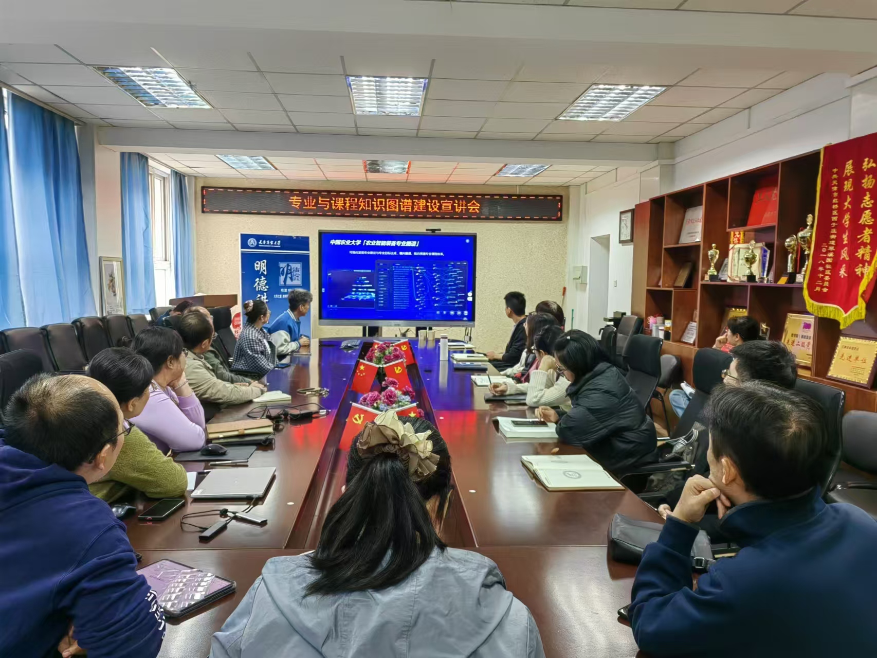 会上,郝志强介绍了专业与课程知识图谱建设的重要意义,对学院申报专业知识图谱建设工作的相关进展进行了介绍。超星数图信息技术有限公司天津课程建设总监王宏及天津课程编辑部设编师未聪、康静霞三位主讲人员,通过相关院校的专业建设和课程建设案例,深入浅出的介绍了专业与课程知识图谱的建设方法,演示了AI助手辅助课件设计、作业批改等教学场景。宣讲结束后,老师们还就知识图谱建设和AI工具应用与主讲人员开展了深入的交流。