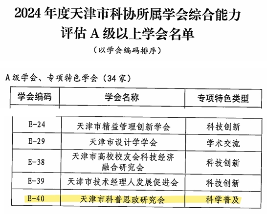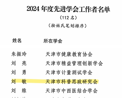 近日,天津市科学技术协会公布了《关于2024年度市科协所属学会综合能力评估结果的通报》和《关于表扬2024年度先进学会工作者的决定》。由我校牵头成立的天津市科普思政研究会获评A级学会专项特色学会,我校理学院教师刘敏荣膺"先进学会工作者"称号,标志着我校在科普思政领域实现组织建设与人才培育的双突破。